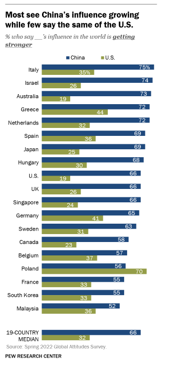 Pew Research has found that many countries when surveyed recognized China as having growing influence and the United States as having declining influence. Many of these countries are even allies of the United States. They may change their mind to back the growing stronger power instead of remaining loyal to the United States as an ally.