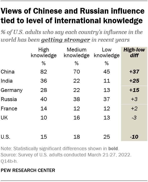 Further, Americans more aware of international events and geopolitics were more likely to be aware of China and Russia’s influence according to Pew Research.